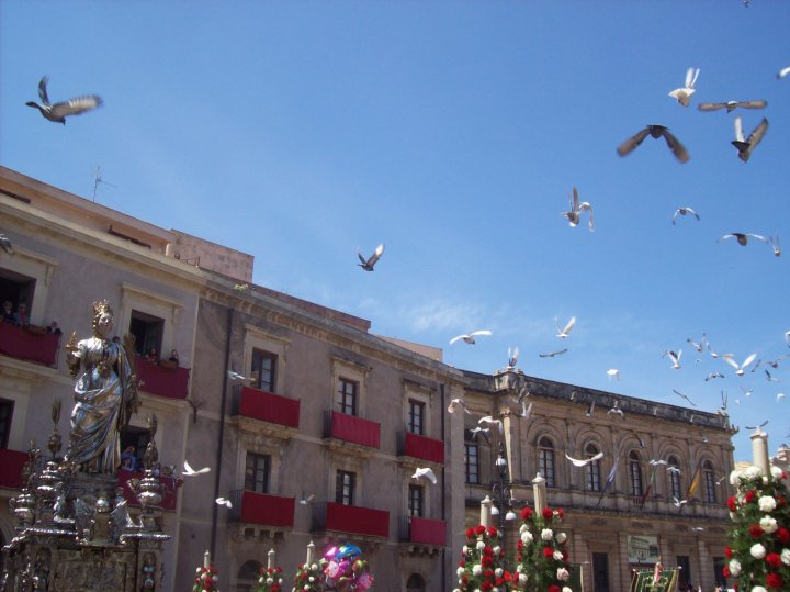 Nuevamente, el día de Pentecostés, en Mineo, la paloma se convirtió, a pesar de sí misma, en un símbolo del Espíritu Santo: después de ser decorada con cintas se roció con espíritu (esta vez no el santo) y, durante la misa cantada, se prendió fuego al plumas del ave, que revolotearon dentro de la iglesia, hasta que aterrorizada y en el estado que uno puede imaginar, cayó al suelo destrozada[ 6 ].